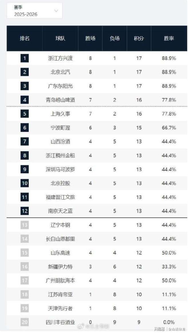 山西汾酒、浙江稠州金租、深圳馬可波羅、北京控股、福建晉江文旅、南京天之藍(lán)、遼寧本綱、以及吉林長白山恩都里。以上8支球隊(duì),戰(zhàn)績均為4勝5負(fù),分列積分榜第7至14位。