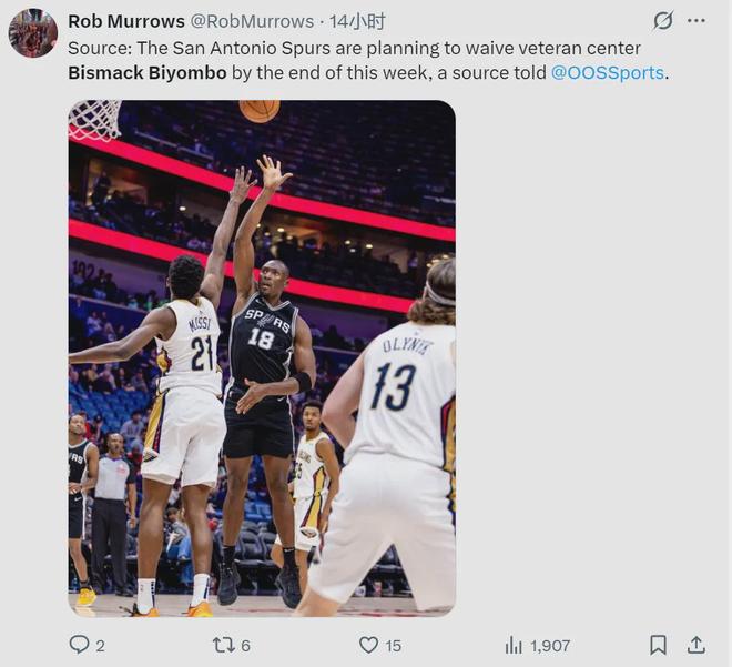 據(jù)NBA記者Rob Murrows報道,馬刺計劃在本周裁掉老將比永博,為即將到來的交易市場做好提前準備。如今的比永博確實打不上球了,他已經(jīng)連續(xù)6場比賽被DNP。自12月份至今,比永博一共只出戰(zhàn)了3場比賽,加起來打了16分鐘。