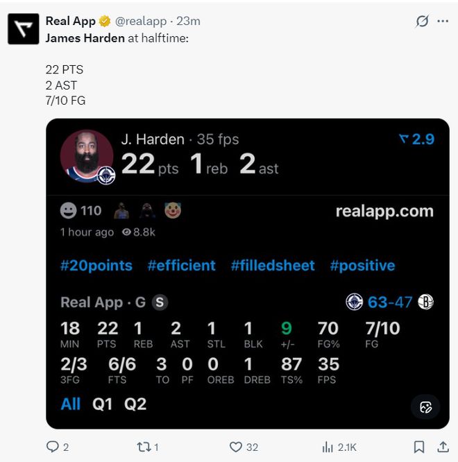 上半場哈登只打了18分鐘,10中7+三分3中2+罰球6中6,拿到22分2助攻1籃板1搶斷1蓋帽,命中率70%,三分命中率66.7%,真實命中率87%,他讓籃網(wǎng)球迷看到了巔峰登再現(xiàn)。
