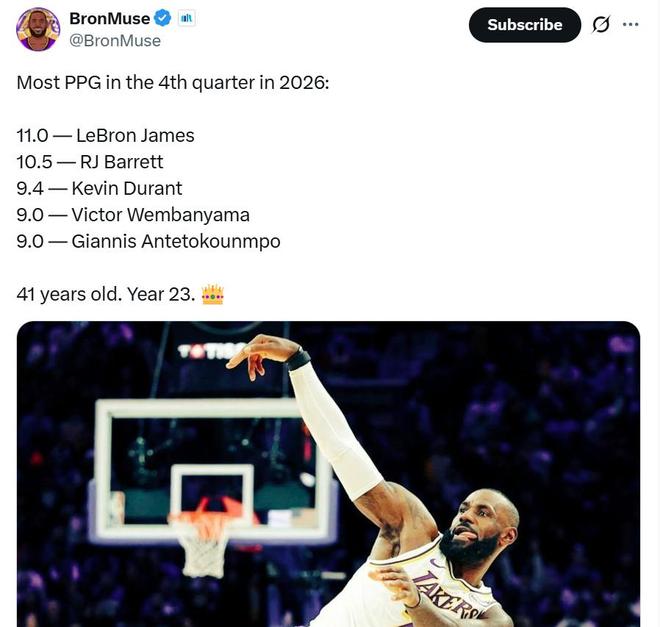 無奈的是歲月不饒人,哪怕詹姆斯能夠調(diào)整體能分配,將更多能量留到第四節(jié)沖刺,但41歲的他也無法保證一整節(jié)都能在攻防兩端持續(xù)交出高質(zhì)量表現(xiàn)。