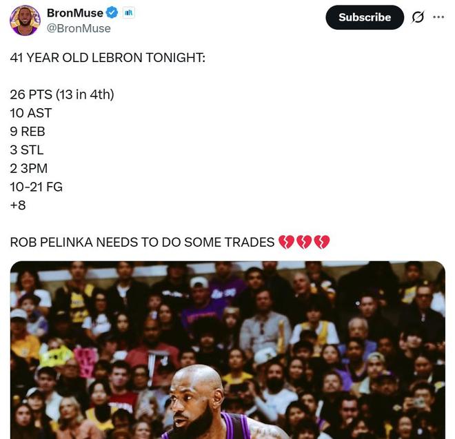 賽后湖媒BronMuse直言:“佩林卡需要做一些交易了?!?/p>