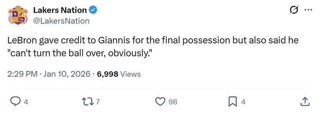 賽后接受采訪,詹姆斯對(duì)那一次關(guān)鍵的失誤公開道歉:“對(duì)我來說,那個(gè)回合實(shí)在是太糟糕了,我在關(guān)鍵時(shí)刻失誤了,字母哥從后面把球拍掉,那是個(gè)精彩的防守,我顯然不能在那種時(shí)刻犯錯(cuò)?!?/p>