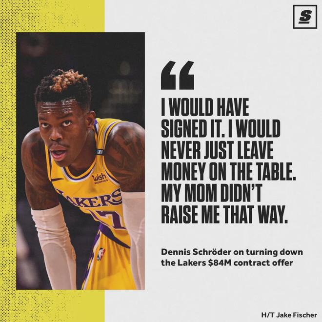 2020年12月,施羅德拒絕湖人2年3340萬美元的續(xù)約合同。2021年3月,多家媒體報(bào)道,施羅德拒絕湖人開出的4年8000萬美元續(xù)約合同。2021年休賽期,施羅德1年590萬美元加盟凱爾特人,他拒絕大合同的事情也被拿出來群嘲。