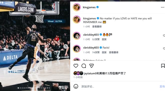 在Instagram動(dòng)態(tài)中,詹姆斯為多年來(lái)支持他的人、以及那些對(duì)他惡語(yǔ)相向的人,都留下了這句震撼的話。他還附上了湖人以141-116戰(zhàn)勝老鷹一役的多張賽場(chǎng)照片。塔圖姆在內(nèi)的多名球員為詹姆斯點(diǎn)贊。