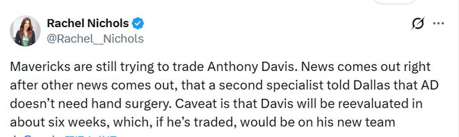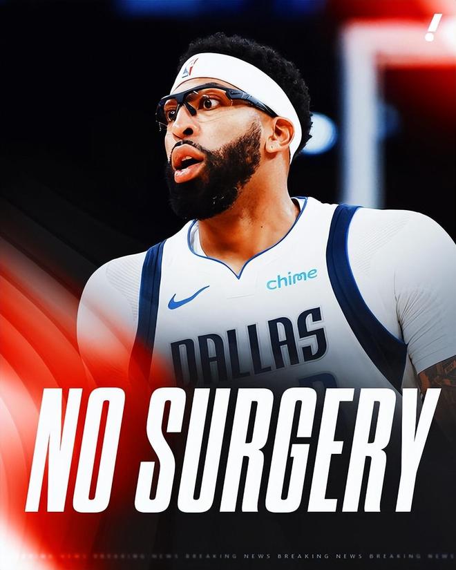 NBA記者Nichols表示,獨(dú)行俠仍在嘗試交易戴維斯。就在另一位專家告知達(dá)拉斯,戴維斯的左手無需接受手術(shù)的消息傳出后不久,這一動態(tài)隨即曝光。需要注意的是,戴維斯將在約六周后接受復(fù)查 —— 如果屆時(shí)他已被交易,這次復(fù)查就將由他的新球隊(duì)來安排。