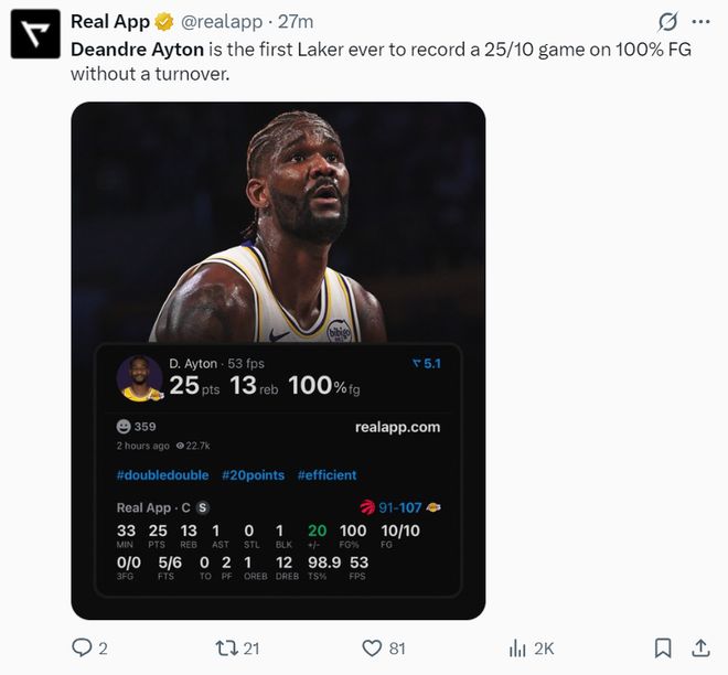 這場(chǎng)比賽后艾頓創(chuàng)造了多項(xiàng)紀(jì)錄:1.艾頓成為湖人隊(duì)史首位100%+25+10+0失誤的球員;