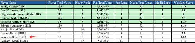 詹姆斯最終的球迷票數(shù)是1819776票,在西部排名第8,他的媒體票得到3張,在西部排名第9,他的球員票得到53張,在西部排名第8。他的加權(quán)積分是8.25,總票數(shù)排名西部第9,落后于約基奇、東契奇、亞歷山大、庫(kù)里、文班亞馬、愛德華茲、阿夫迪亞、杜蘭特。