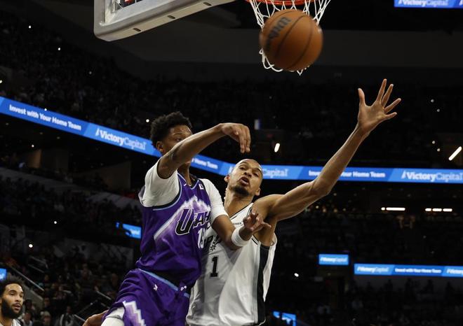 馬刺過去兩場連續(xù)主場戰(zhàn)勝雄鹿與森林狼收獲2連勝,爵士過去3場遭遇3連敗,本賽季首次交鋒馬刺主場114-127輸給爵士。本場馬刺缺少瓦塞爾,爵士缺少凱斯勒、馬爾卡寧、哈克萊斯、尼昂、森薩博。首節(jié)開局馬刺7-8落后,文班亞馬連中兩記三分反超,馬刺被追到15-13僅領(lǐng)先2分。文班亞馬再中三分,馬刺依然被追到20-18僅領(lǐng)先2分,馬刺內(nèi)外開花逐步擴大34-24領(lǐng)先優(yōu)勢,菲利波夫斯基中投得分,首節(jié)比賽結(jié)束馬刺34-26領(lǐng)先爵士。
