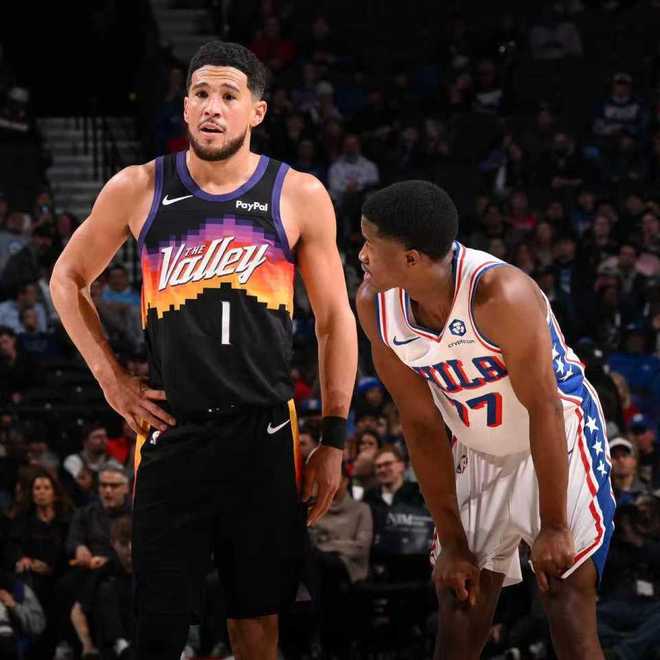 太陽過去兩次連續(xù)客場戰(zhàn)勝尼克斯與籃網(wǎng)收獲2連勝,76人上一次主場113-104戰(zhàn)勝步行者。本場太陽迎來杰倫-格林復出,76人缺少恩比德與喬治兩位核心。首節(jié)開局太陽2-8落后,太陽連追4分,烏布雷三分命中,太陽連追3分。雙方隨后持續(xù)纏斗至太陽17-19落后,烏布雷再中三分,太陽連追4分。76人一波8-0攻勢擴大9分優(yōu)勢,太陽一波6-0攻勢追分,首節(jié)結束太陽27-30落后76人。首節(jié)太陽21中8,其中三分6中0,布克6中2得到9分;76人24中11,其中三分13中5,埃奇庫姆7中4得到10分與烏布雷3記三分11分,馬克西5中0得到0分。
