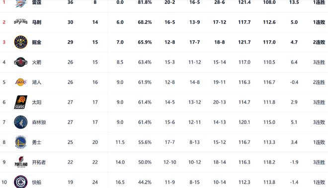 從目前西部的排名來看,雷霆仍然是以36勝8負(fù),排名西部第一,他們領(lǐng)先第二名的馬刺6個(gè)勝場(chǎng)。西部前三的爭(zhēng)奪相比起第三到第七位不是特別激烈,掘金和火箭分列二、三位。