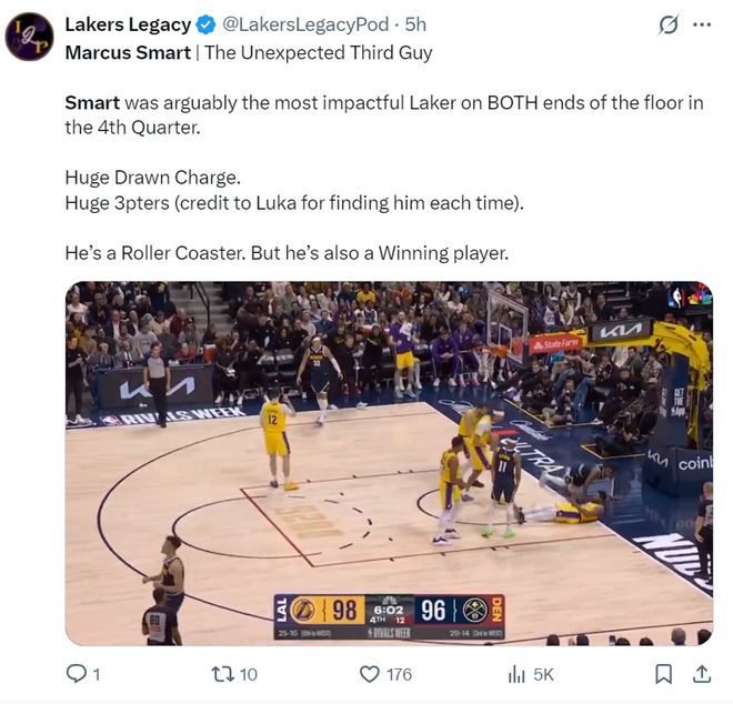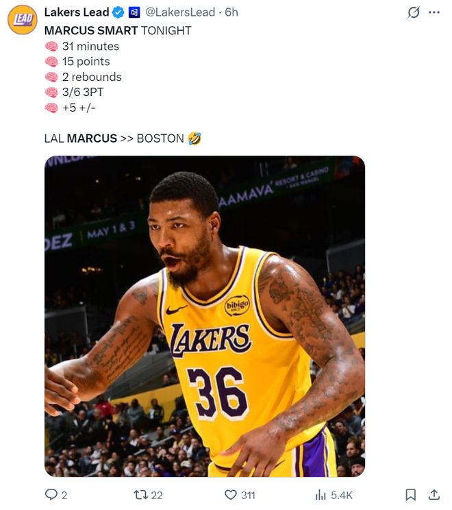 湖人媒體是這樣評價斯瑪特:斯瑪特是讓人意想不到的第三得分點,他在第四節(jié)無疑是湖人攻防兩端最出色的球員,巨大的三分球命中建立巨大的領(lǐng)先優(yōu)勢。