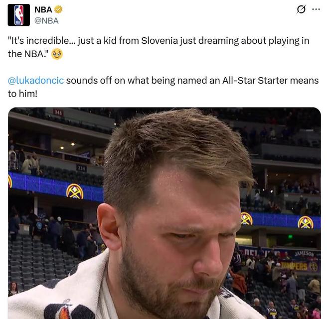 詹姆斯也在賽后送上祝福:“要向盧卡致敬,他是全明星票王,你能看到今晚他球衣上的徽章真的很酷,他當(dāng)之無(wú)愧。”