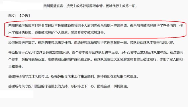 值得一提的是,在剛剛,CBA本賽季第六個(gè)下課的主教練也是產(chǎn)生了,他就是四川隊(duì)主教練韓碩,根據(jù)四川隊(duì)公布的內(nèi)容,此番韓碩下課,是他本人主動(dòng)申請(qǐng)辭職,隨后,四川隊(duì)也是與韓碩進(jìn)行了充分地溝通,最終,做出了一個(gè)無(wú)奈的選擇,尊重韓指導(dǎo)的個(gè)人意愿,同意了他的辭職。