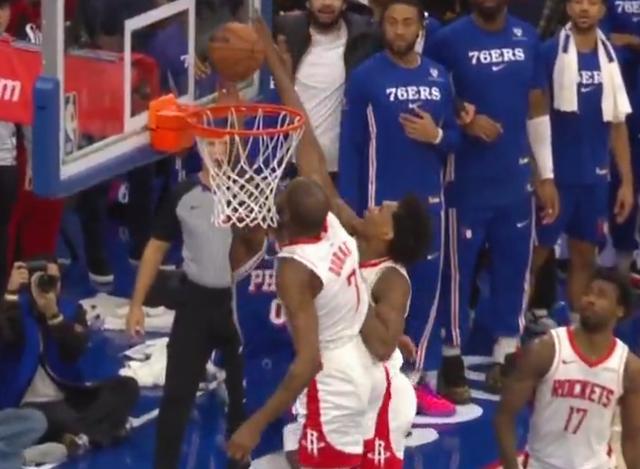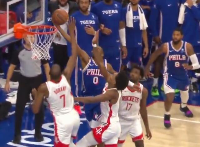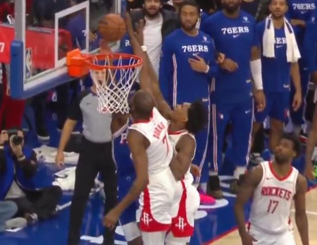 比賽末節(jié)最后時(shí)刻,雙方115-115戰(zhàn)平,76人后衛(wèi)馬克西持球突破沖進(jìn)內(nèi)線完成上籃,在籃球觸碰到籃板后,火箭前鋒杜蘭特再次觸碰籃球,按照規(guī)則應(yīng)該是干擾球違例,但裁判并未吹罰。