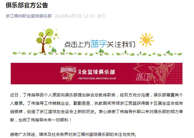 北京時(shí)間2月5日,在2025年12月25日,浙江男籃官方發(fā)布公告,表示主帥丁偉轉(zhuǎn)任俱樂部男籃總教練。如今浙江男籃再度發(fā)布公告,丁偉指導(dǎo)因個(gè)人原因向俱樂部提出辭去總教練職務(wù),經(jīng)雙方充分溝通,俱樂部尊重其個(gè)人意愿。