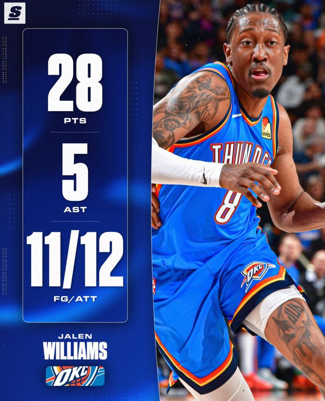 雷霆第二核心杰威在背靠背的第一場20分鐘,12中11,三分2中2,拿到28分5助攻4籃板發(fā)揮非常出色,但他在這場比賽中再度遭遇了腿筋拉傷。