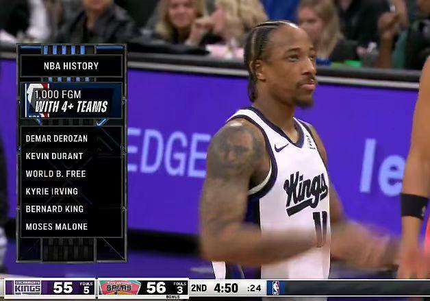 德羅贊在4支球隊達(dá)成命中1000記運動戰(zhàn)進(jìn)球里程碑,成為NBA歷史第6人,前5人分別是杜蘭特、弗里、歐文、伯納德-金與摩西-馬龍。