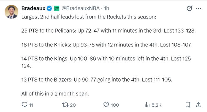休媒曬出過去兩個(gè)月內(nèi),火箭隊(duì)已經(jīng)有四次下半場(chǎng)領(lǐng)先至少13分的情況下被逆轉(zhuǎn)了,最慘烈的一場(chǎng)是下半場(chǎng)領(lǐng)先鵜鶘25分卻被逆轉(zhuǎn)了。這場(chǎng)是領(lǐng)先尼克斯18分被逆轉(zhuǎn)。