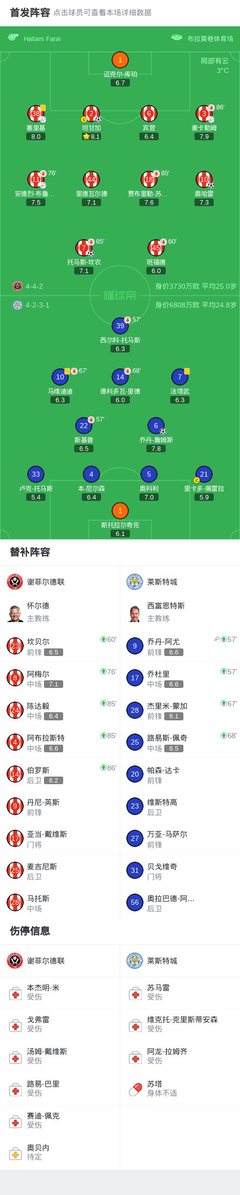 北京時(shí)間1月2日英格蘭足球冠軍聯(lián)賽 聯(lián)賽 第25輪,謝菲爾德聯(lián)主場(chǎng)對(duì)陣萊斯特城。謝菲爾德聯(lián)坦甘加破門,托馬斯-坎農(nóng)破門,奧哈雷破門。萊斯特城喬丹-詹姆斯破門。最終比分謝菲爾德聯(lián) 3-1 萊斯特城。