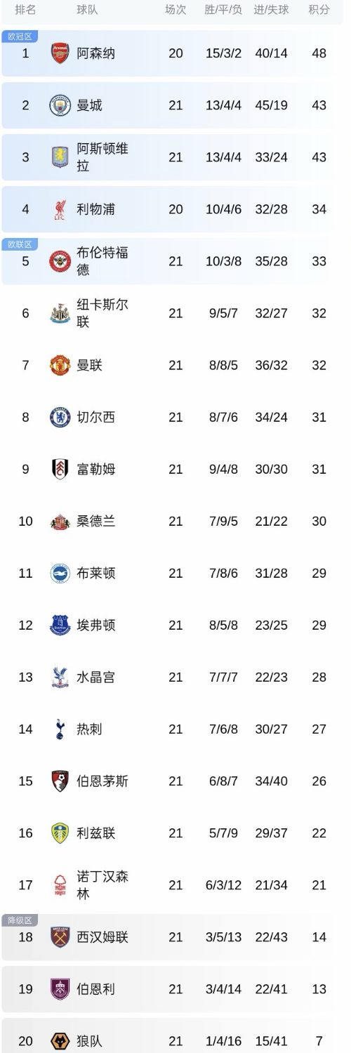 北京時間1月8日,英超聯(lián)賽第21輪結(jié)束多場比賽的爭奪,幾支豪門球隊相繼翻車丟分,對于阿森納來說極為有利,槍手有望擴大領(lǐng)先優(yōu)勢,劍指英超冠軍。英超一夜5場冷門!曼城3連平,曼聯(lián)+切爾西換帥白搭,積分榜大亂。