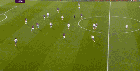 真正打開了空間的進(jìn)攻,直至第31分鐘才出現(xiàn),庫(kù)尼亞先拉邊,再進(jìn)中路,就和布魯諾有了聯(lián)系的可能性: