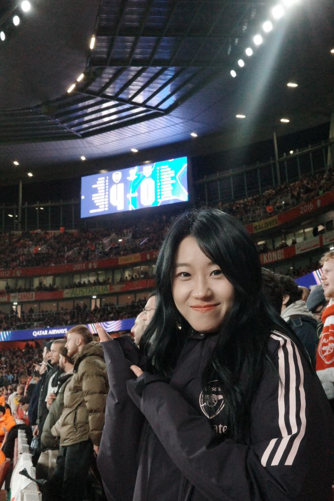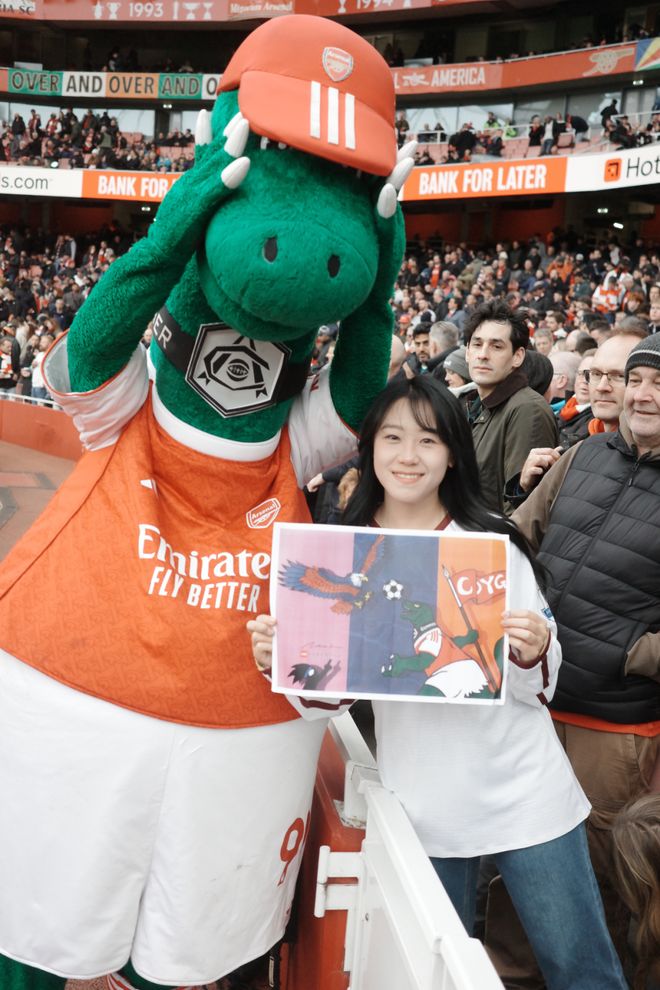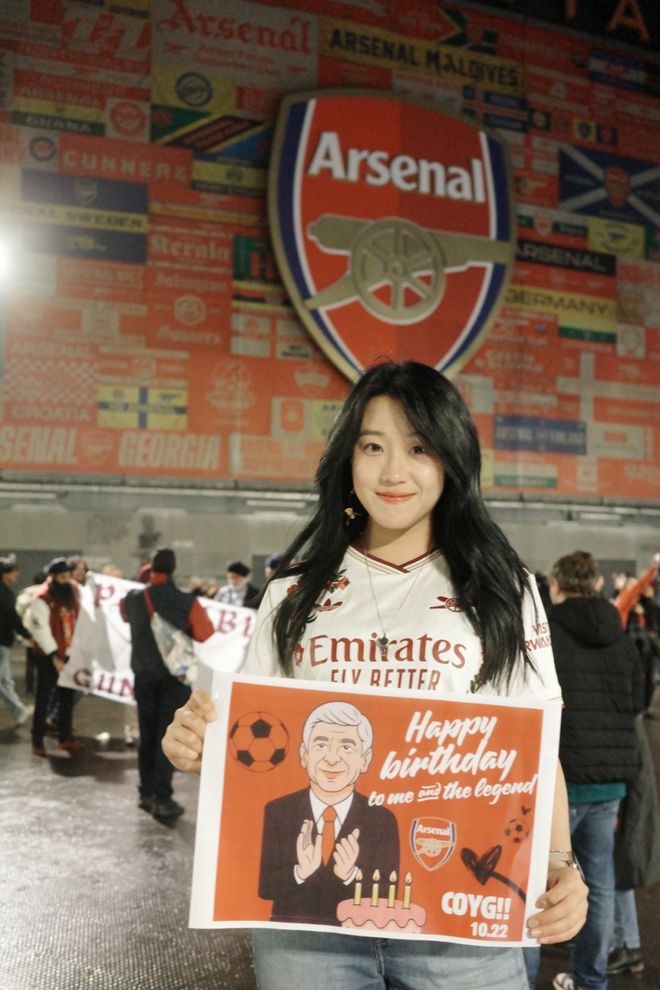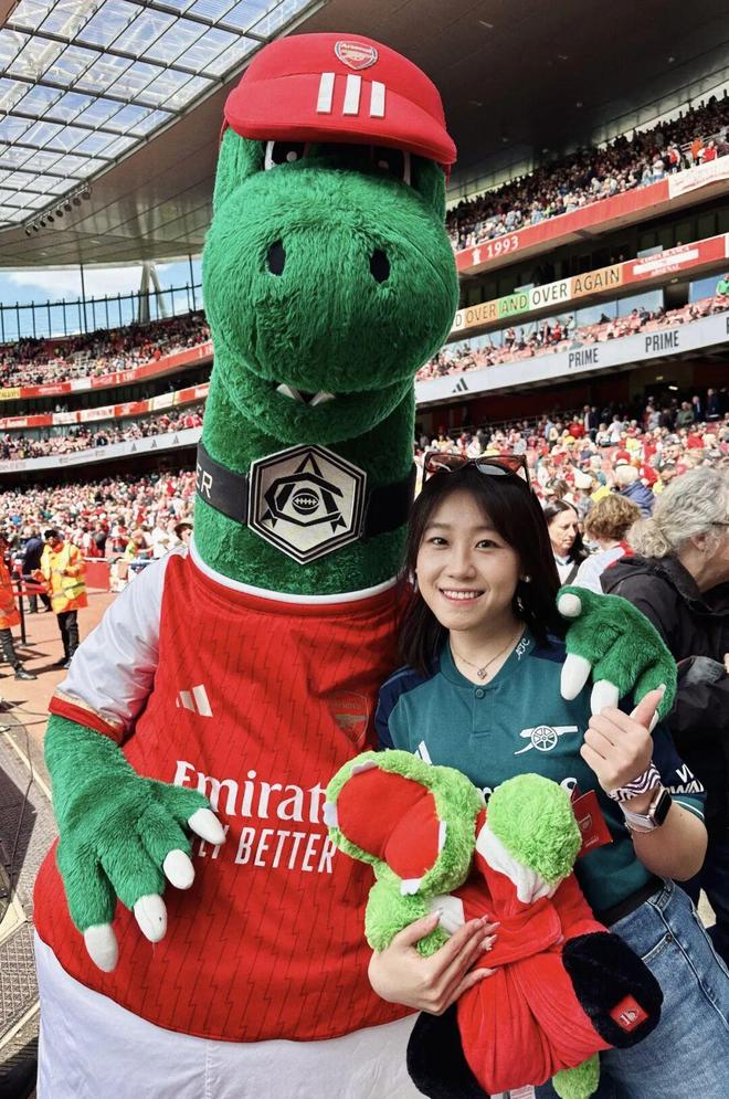 A:我叫菲菲,是一名95后女球迷,出生在山東濟(jì)南。我的俱樂部主隊(duì)是阿森納,因?yàn)楝F(xiàn)在在倫敦工作,所以每到世界杯或大賽,我也會(huì)選擇支持英格蘭。我和足球的最初記憶其實(shí)非常生活化。小時(shí)候的夏夜,會(huì)跟著爸爸去濟(jì)南的燒烤攤看世界杯,老電視、小板凳,還有一群陌生卻因?yàn)樽闱蜓杆贌峤j(luò)起來的大人們?,F(xiàn)在回想起來,那些畫面都還是特別珍貴的記憶。中學(xué)時(shí),班里大部分同學(xué)都是皇馬和C羅的球迷,每天都能聽到朋友們聊足球,我們也會(huì)一起去看山東泰山的主場(chǎng)比賽。上大學(xué)之后,我更多是看世界杯和歐洲杯,不太會(huì)熬夜追聯(lián)賽。直到去英國(guó)讀書,才和室友們一起關(guān)注英超的各種動(dòng)向。但真正的轉(zhuǎn)折點(diǎn),是去年正式來到倫敦工作,我才開始盡量一場(chǎng)不落地走進(jìn)球場(chǎng)支持自己的主隊(duì)。截至目前,我已經(jīng)在現(xiàn)場(chǎng)看過45場(chǎng)比賽,這種連接是過去十幾年隔著屏幕無法比擬的。我想我這輩子都會(huì)是阿森納球迷了。