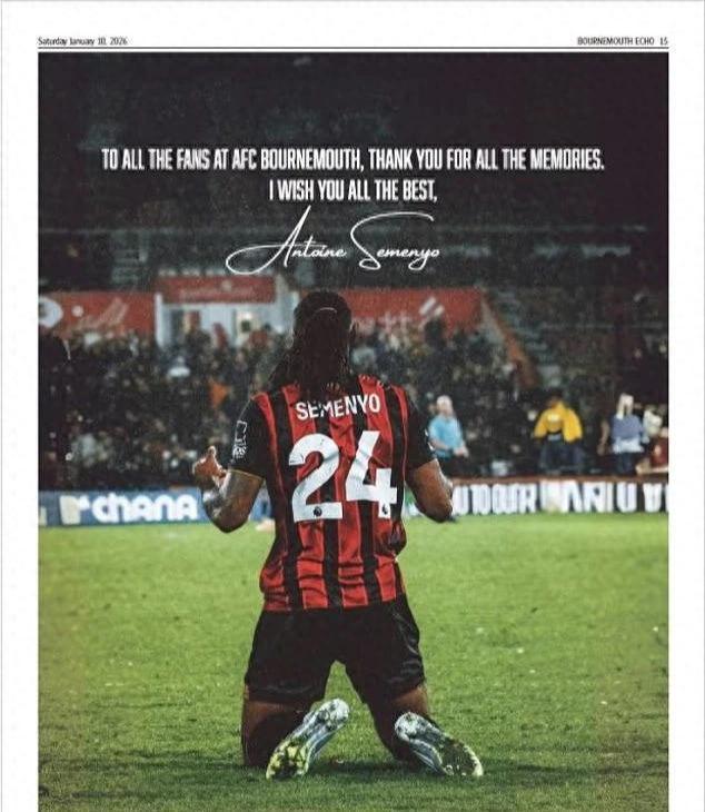 在這份刊登于周六版面第15頁的廣告中,塞梅尼奧深情地寫道:“致AFC伯恩茅斯的所有球迷,感謝你們給予我的所有美好回憶,祝你們一切順利?!辈⒂H筆簽上了自己的名字。