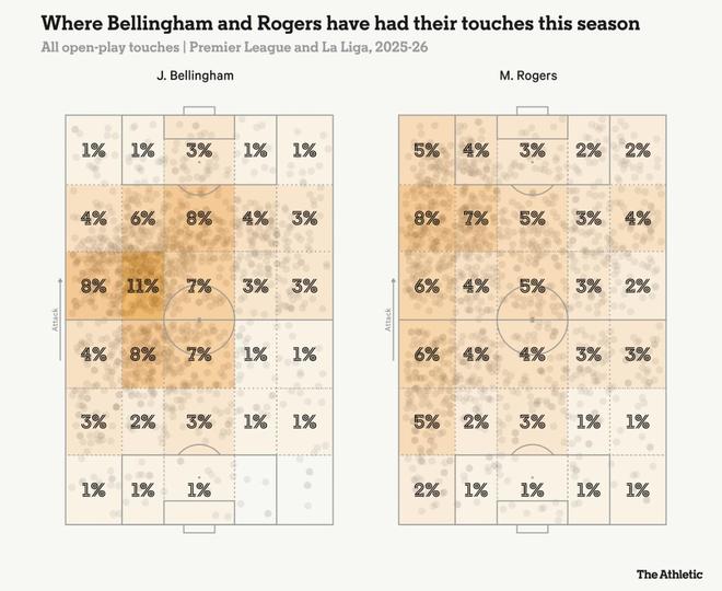 貝林厄姆尚未找回他在2023-24賽季的進攻巔峰狀態(tài)——當時他在28場西甲比賽中打進19球。上賽季他僅有9球入賬,本賽季至今也只有4球,不過這其中存在一些客觀因素。他因肩傷恢復而推遲開啟賽季,同時從下方觸球熱區(qū)圖可以看出,他承擔了比羅杰斯更多的防守任務,在進攻三區(qū)的觸球比例低了11個百分點。