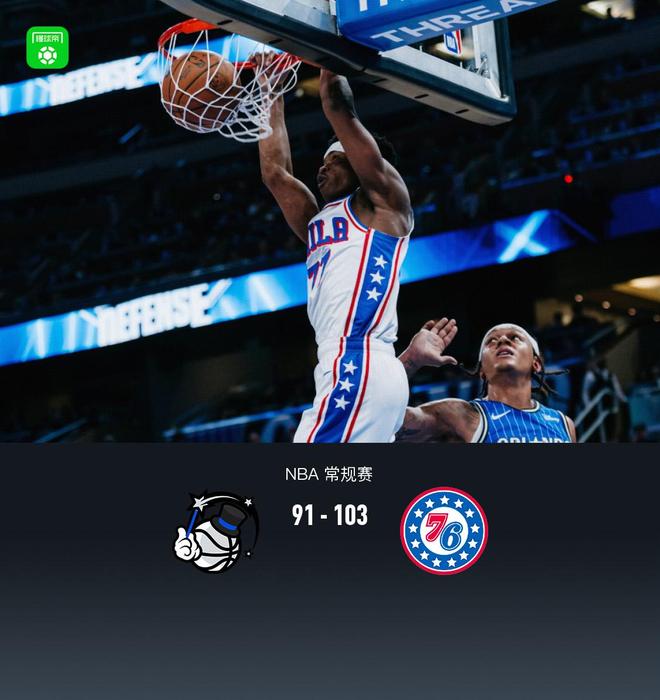 • 76人103-91力克魔術(shù),馬克西29分,恩比德22+9