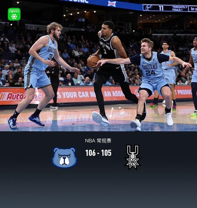 • 灰熊106-105極限逆轉(zhuǎn)馬刺,斯賓塞連中關(guān)鍵球得21+7+8,文班空砍30分
