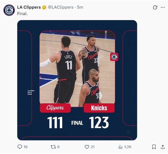 • 3人很致命!快船111-123尼克斯:登卡48+6+13末節(jié)崩盤!